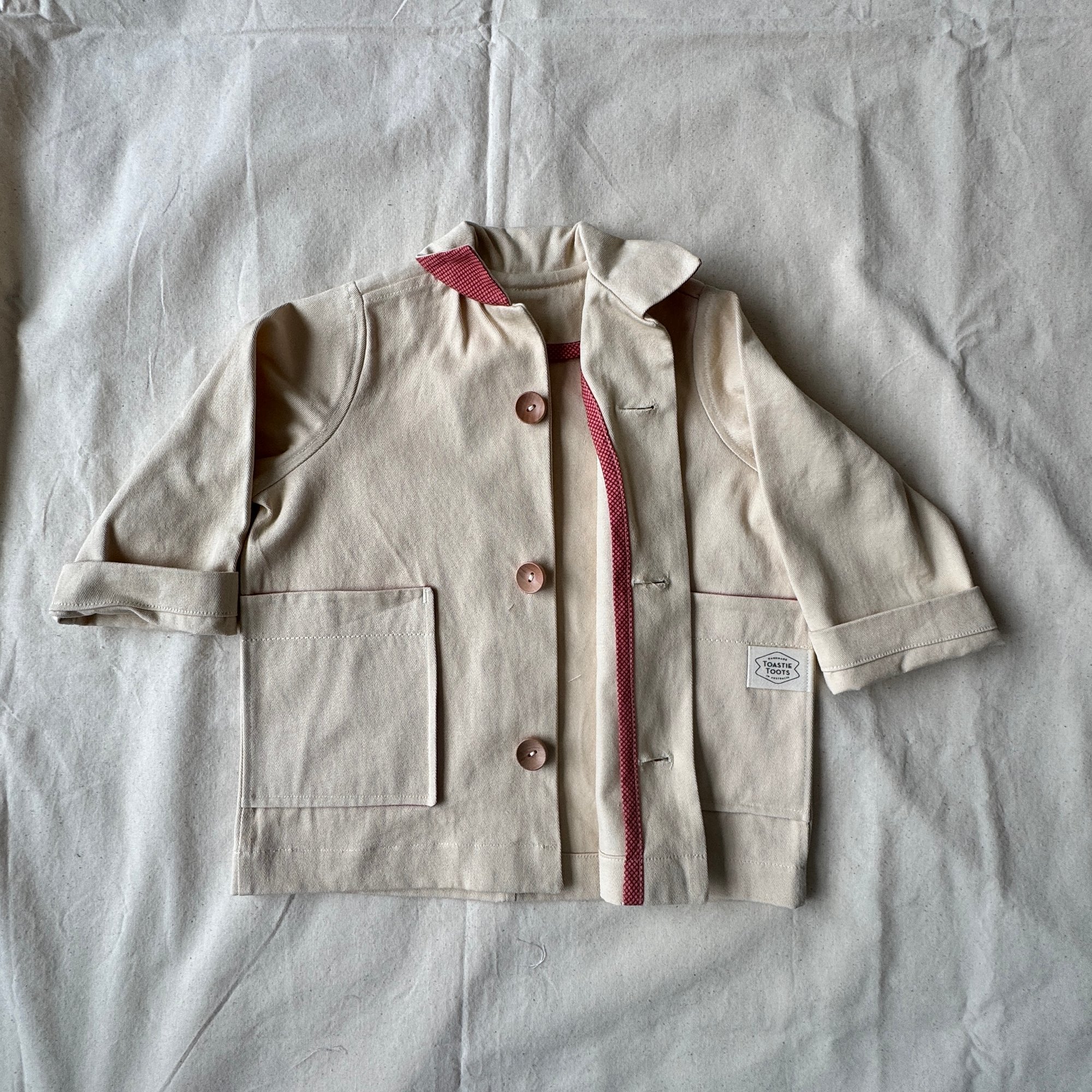 A new design for w25, this relaxed, boxy fit style jacket is handcrafted in a beautiful soft cotton drill. It features three wood buttons, two front panel pockets with contrast inner lining (mini raspberry gingham) and collar with contrast lining. A beautiful heirloom piece to pass on. Layer over any of our cute outfits.